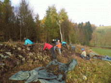 Hier leistete man geradezu Sensationelles. Auf über 80 m Länge wurde die Steinrücke nicht nur fachgerecht "Auf-den-Stock" gesetzt sondern auf der gesamten Länge abgeplaggt. Das heißt, von Grasbewuchs, Himbeeren, Brennnesseln und heranwachsenden Trupps von Traubenkirsche auch im Randbereich befreit. Man könnte jetzt sagen, ja „viele Hände“… aber diese Hände waren bergwaldprojektmäßig bereit und willig. Nun fügt sich die Steinrücke harmonisch in das Gebiet am Schwarzbachgrund ein und bietet Platz und Lebensraum für die Wiederansiedlung von Zielarten wie Arnika, Feuerlilie und Buschnelke. Ein phantastischer Pflegefall, als Vorzeigesteinrücke beachtlich, aber nicht verallgemeinerungsfähig. Der Versuch, völlig zugewachsene Steinrücken vom Bewuchs zu befreien ist im Projektverlauf mehrfach probiert worden, ist aber vom zeitlichen und finanziellen Aufwand im Rahmen einer „normalen“ Steinrückenpflege nicht praktikabel.