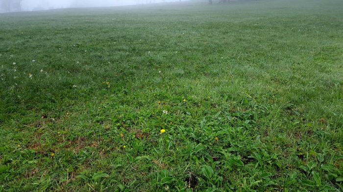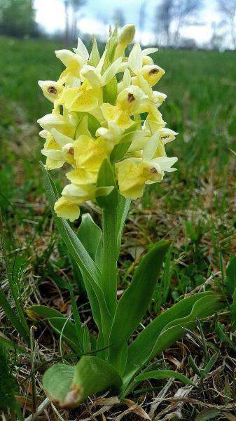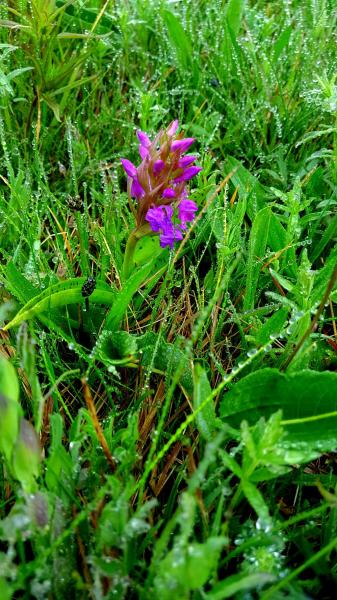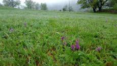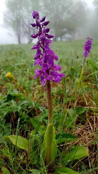 Unbeschadet zeigen sich trotz Nebel und Kälte auf der gesamten Fläche zahlreiche Trollblumentrupps und die ersten neugierigen Majalis, das Breitblättrige Knabenkraut.