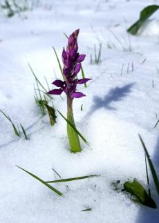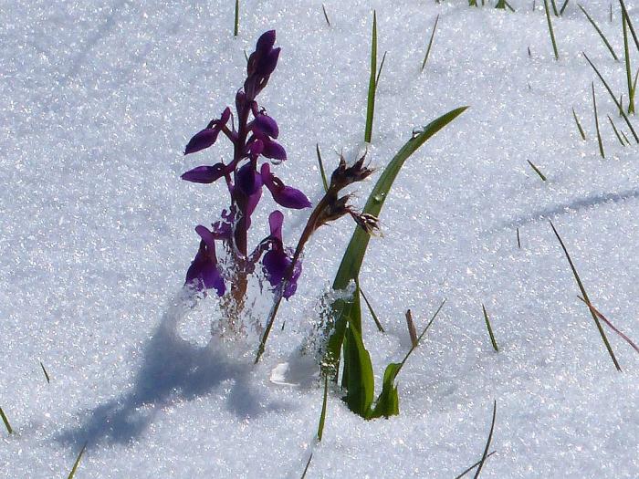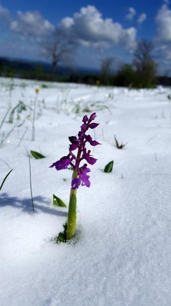 Diese Tage hat die Sambucina, das Holunderknabenkraut am Geisingberg genutzt, um in diesem Jahr unbeschadet durch die Blühphase zu blühen. Im vorigen Jahr genau am 5. Mai mußte jede einzelne die schwere Last einer bis zu 3 cm hohen Schneekappe (er)tragen. In diesem Jahr konnten sie die sonnigen Tage ungestört und in voller Blütenpracht genießen.