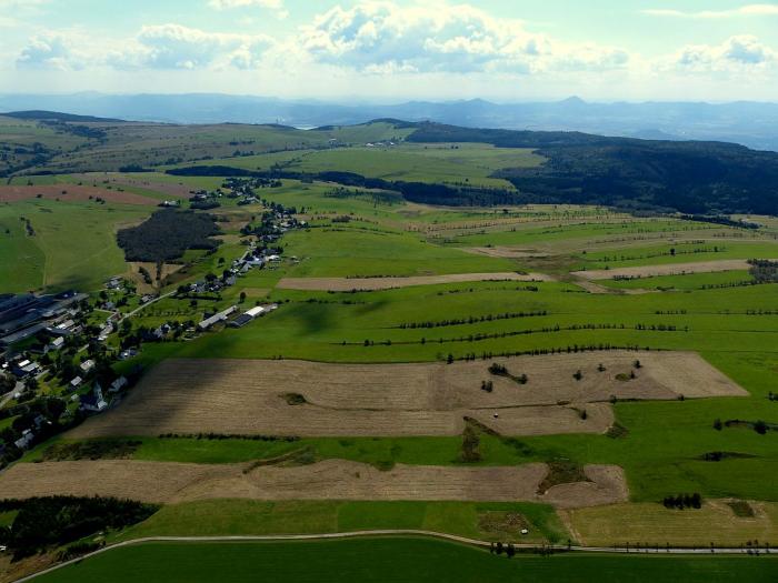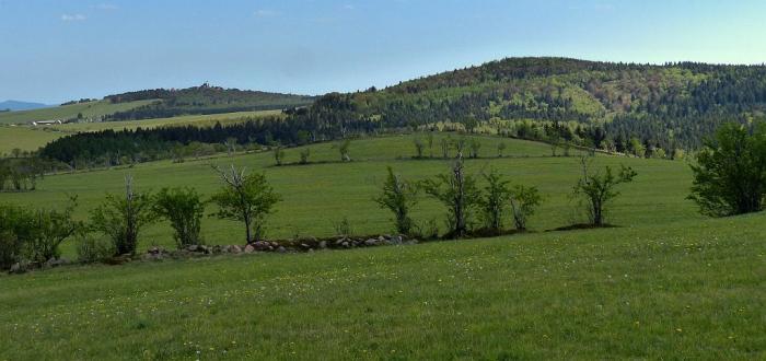 wie in Richtung Osten den Blick auf den Fürstenauer Kirchturm und den Sattelberg oder Spicak im Hintergrund.