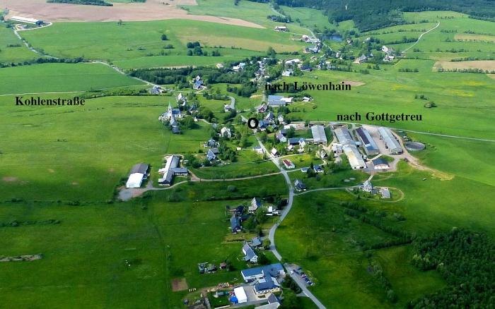 In nördlicher Richtung geht es vorbei an den Bauernhäusern, die unmittelbar an der Dorfstraße stehend den Abschluss der langen, markanten Hufen bilden, die sich kilometerweit Richtung Westen über Traugott- und Pfarrhöhe hinweg bis zur tschechischen Grenze erstrecken.