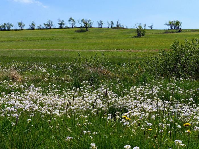 Nun geht es gemächlich ansteigend an mit wiesenschaumkrautgeschmückten Nasswiesenbereichen vorbei auf 700 m Höhe. Die erste Erhebung hinter der Fürstenauer Kirche, die Pfarrhöhe, ist 784 m hoch.