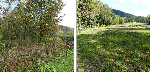 Westlicher Randbereich der Knöterichfläche vor Beginn und nach Abschluss der Arbeiten