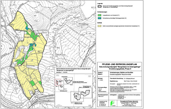 Die Auswirkungen dieser Vorbelastungen können in diesem Fall nur mit Hilfe zusätzlicher Projektmaßnahmen wie Beräumung, Bodenab- und Neuauftrag und Mähgutübertrag verringert werden (Textkarte 20/ PEP, Ausschnitt).