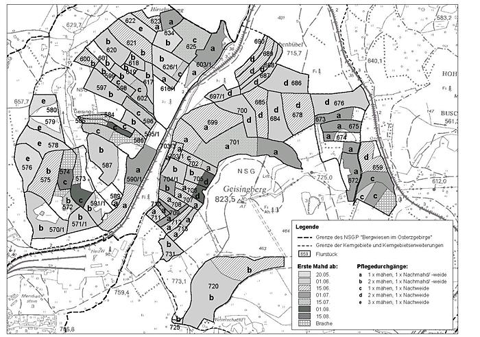 Leitbild, Ausgangszustand und Artenschutzmaßnahmen bestimmen die naturschutzgerechte Form der dauerhaften pfleglichen Nutzung des Grünlandes. Dazu sind in den Pflege- und Entwicklungsplänen für einen Großteil der Bergwiesen Mahdtermine ab dem 15. Juni vorgesehen. Neben der Samenreife entschieden die Witterungs- und Aufwuchsbedingungen den optimalen Schnittzeitpunkt für eine erfolgreiche Heuwerbung. Ab dem 15. Juli werden diejenigen artenreichen Bergwiesen einschürig gemäht, die dem Schutzziel bereits annähernd entsprechen und die auf Grund ihres Artenreichtums auch als Spenderflächen für die Mähgutübertragung infrage kommen.
